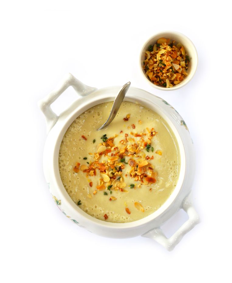 Een romige soep die iedereen lekker vindt, al raden uw dinergasten nooit wat erin zit. Er komt namelijk geen spatje room aan te pas. Het fluwelige effect komt gewoon van een pak plantaardige amandelmelk. U kunt deze soep rustig vooraf maken, invriezen kan ook prima.