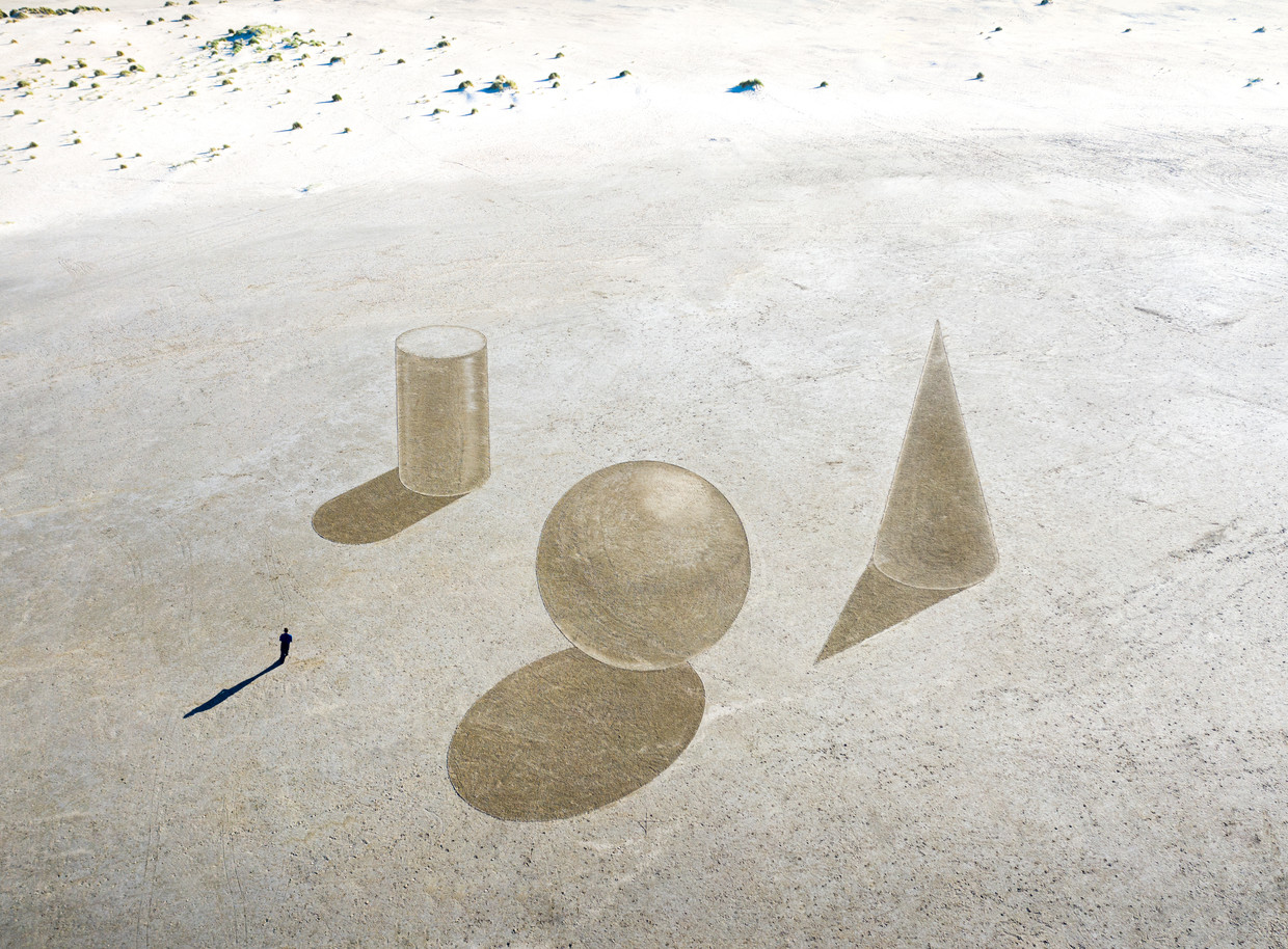 De foto’s heeft hij gelukkig nog wel, van die tientallen meters grote kunstwerken die hij maakt in het zand. De ene keer vormen de strakke lijnen en patronen een scherp contrast met de zee, strand en duinen, een andere keer ontstaat er juist een organisch samenspel.