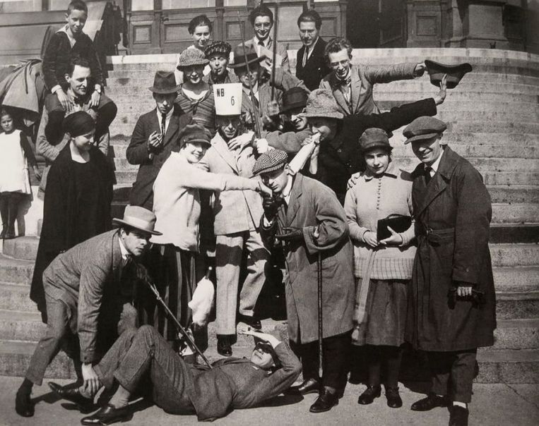 Kurt Schwitters, eveneens kunstenaar, kukelekuut er hard doorheen. En dan wordt er ook nog aangeklopt. Een agent met getrokken wapenstok onderbreekt de Soirée Dada die hier gaande is. Hij bekritiseert de ‘kinderachtige’ avond, die brengt maar ‘verwarring in plaats van inspiratie’. Maar goed, schikt hij in, zijn mening doet er niet toe, hij komt de avond alleen stilleggen vanwege de brandveiligheid. Er is geen vergunning verleend en de zaal zit veel te vol. ‘Iedereen die staat, moet weg!’
