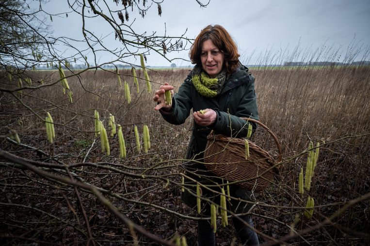 Erachter staat een hazelaar vol lange, gele katjes. Groeneweg, met rieten mand in de hand die ze al heeft sinds haar kindertijd, plukt er wat: “Deze katjes kun je thuis dippen in warme chocolade, laten stollen op bakpapier en dan eten. Ook kun je ze fijnsnijden en als topping in de soep doen. Ze smaken vrij melig, maar door de chocolade of soep wordt het een ware lekkernij. Daarnaast werken ze vochtafdrijvend.”