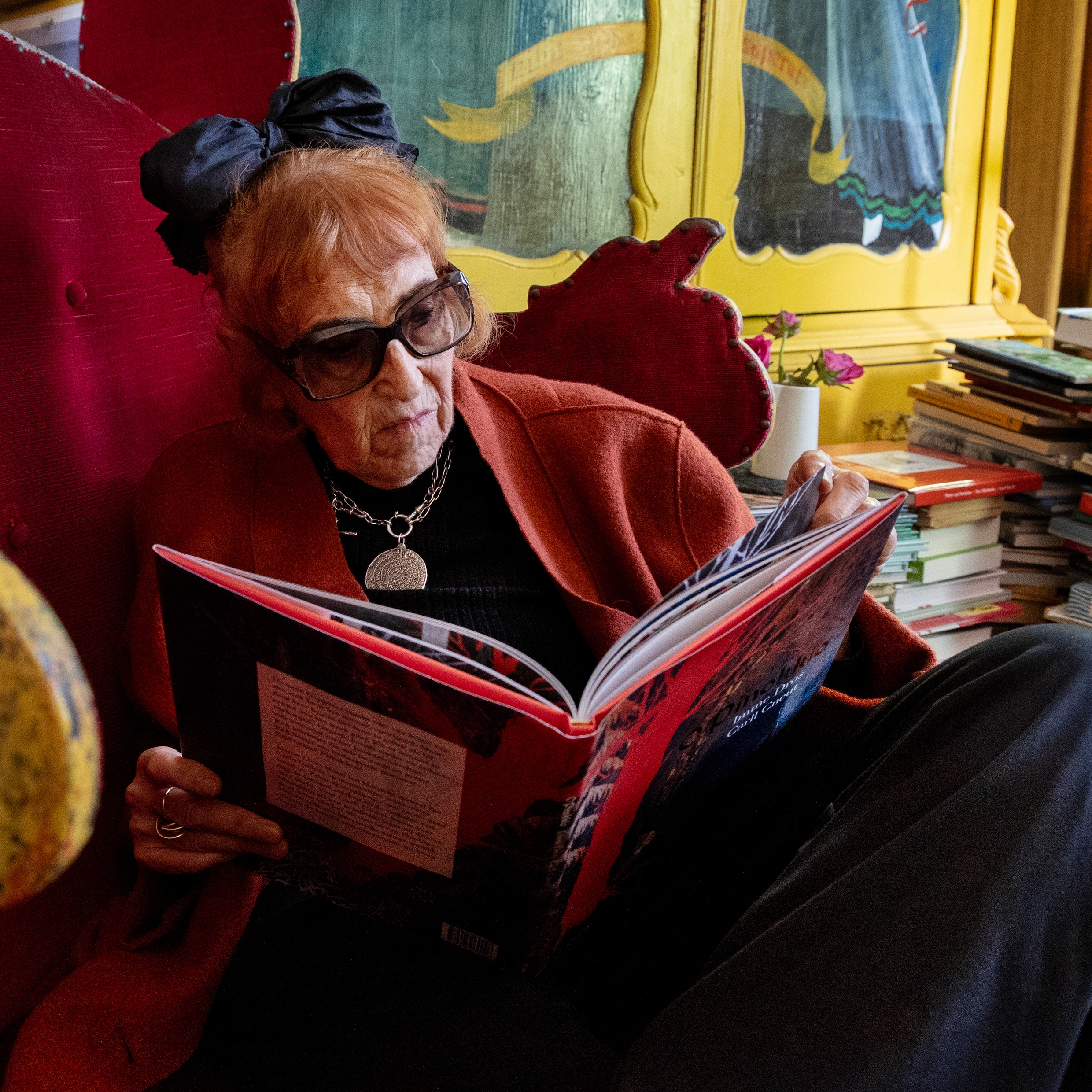 Binnen is het schemerig – Dros kan slecht tegen het felle buitenlicht – maar waar je ook kijkt ontwaar je hoge stapels boeken, schilderijen en andere kunstvoorwerpen van Geelen, en zelfs een levensgrote kartonnen versie van de kunstenaar, die ooit in een boekhandel heeft gestaan.