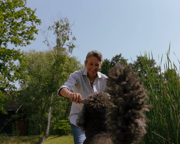 Ze ontvangt in een fantastisch gerestaureerde scheepswerf in Zoeterwoude – “we hebben ons huis ook een verjongingskuur gegeven”. Buiten springt hond Fritz enthousiast tegen de tuindeuren, binnen serveert ze thee met appelflappen en aardbeien. “Het een heb ik gekocht omdat het zo lekker is, het ander vanwege de gezondheidswinst. Wist u dat aardbeien een stofje bevatten dat wellicht veroudering tegengaat? Je moet heel veel aardbeien eten voordat het effect heeft, wel een pond per dag. Maar je zou het stofje in een pil kunnen concentreren.”